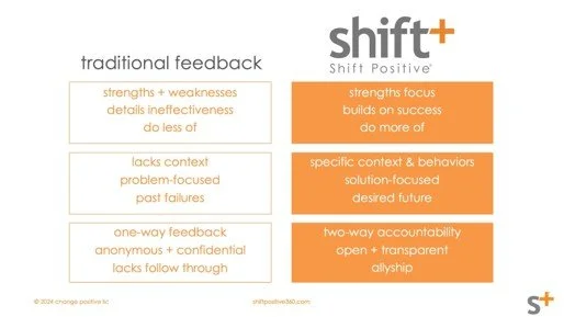 P.S. There is an obvious elephant in the room that should be acknowledged: non-anonymous feedback isn't right for every organization. There is a baseline of trust and psychological safety required for any 360 process to work, let alone the Shift Positive method. Don’t jump headfirst without assessing your environment to determine what would work best.